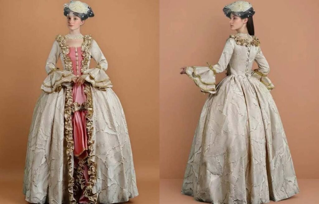 French court sleeves are usually long and fitted from shoulder to elbow, then flared dramatically with tiered ruffles or lace at the forearm. Unlike flared or trumpet sleeves, these often include gathered inserts or contrasting fabrics for visual richness.